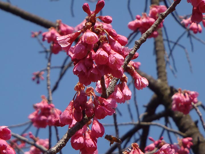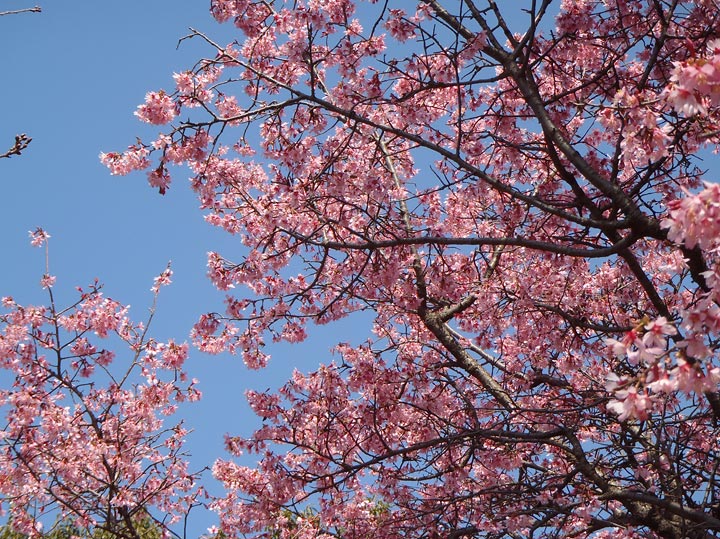 花が、控えめに下を向いて咲くので派手さはありませんが、オカメザクラよりも赤みが強く、花がたわわに生っているのが特徴です。