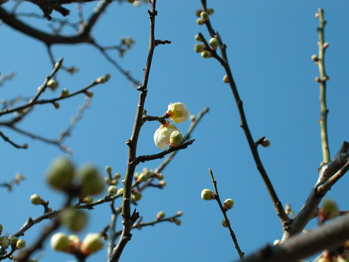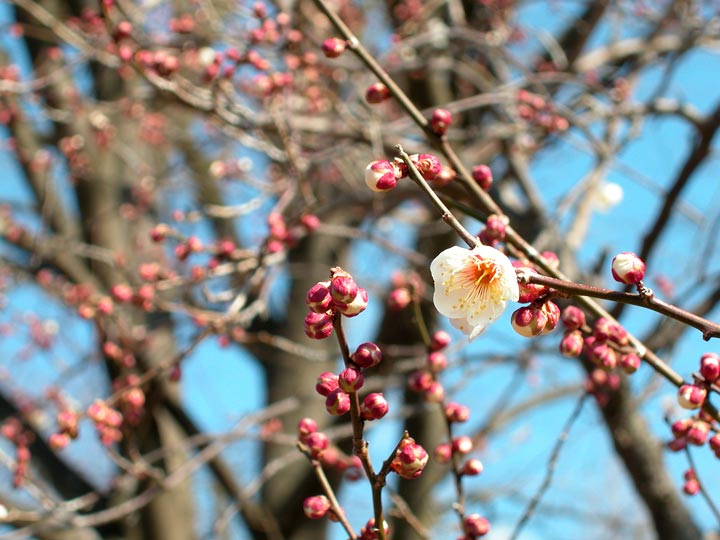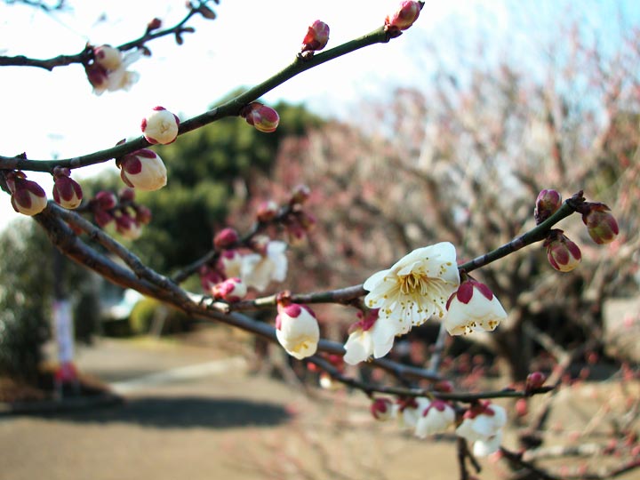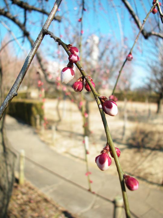 この時期の梅の見所は、色とりどり、たくさんの蕾を楽しめること。