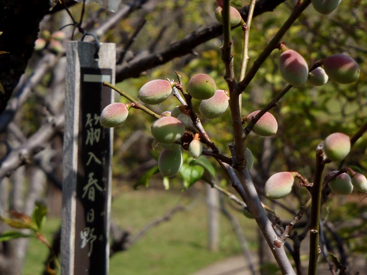 花が終わり、若葉が茂る梅の木には梅の実がなっています。