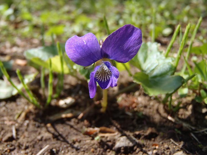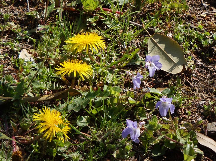 梅の木の下に咲いているのはタンポポばかりでなく、スミレも咲いています。