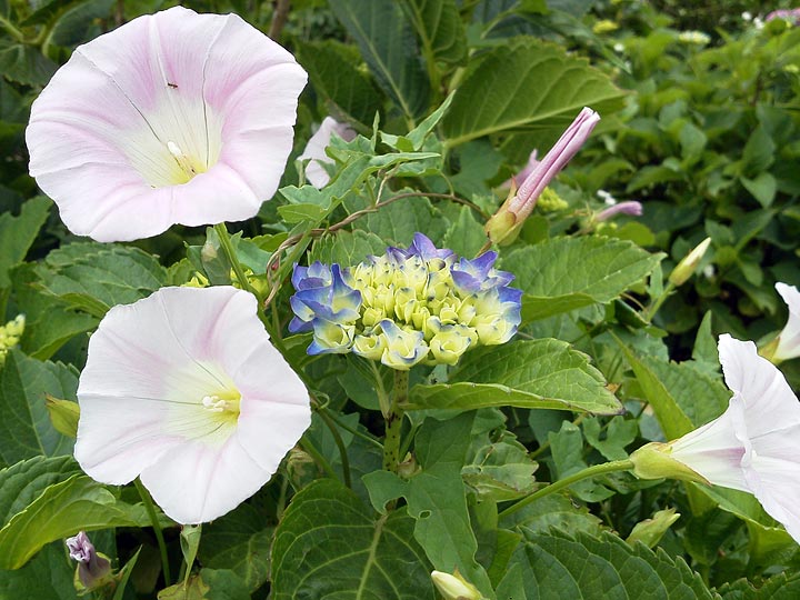 アジサイと一緒に咲いているのが、朝9時半ごろに撮影したので、朝顔か昼顔かは分からない。