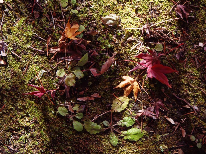 ちょっとカメラを近づけて撮影してみると、緑の苔に落葉を並べた標本のような写真が撮れた。