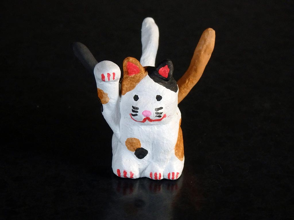 猫が年を経ると猫又に、物が九十九年という長い年月を経ると付喪神になると言われているので、招き猫が年を経ると「招き猫又」になるのでは?と考えて作った。