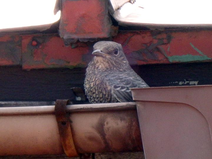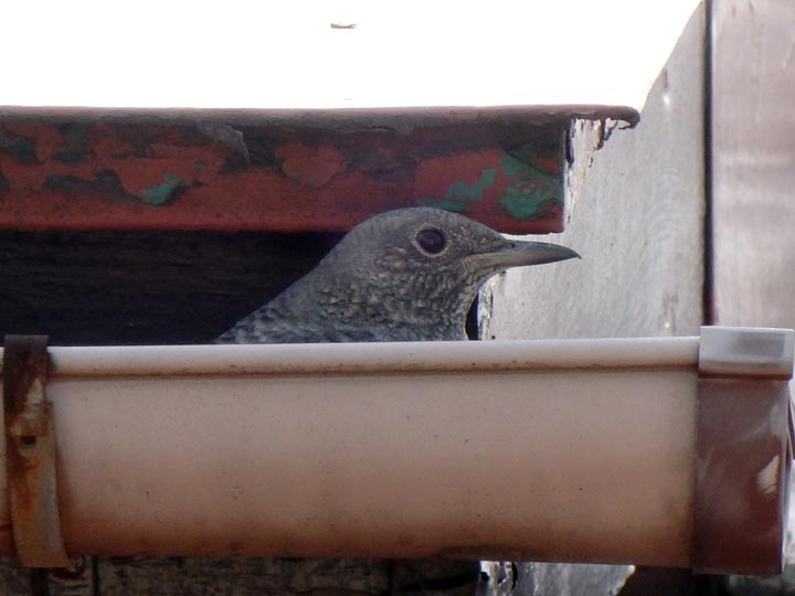 探してみると、隣家の雨どいの中でイソヒヨドリのメスが鳴いていた。