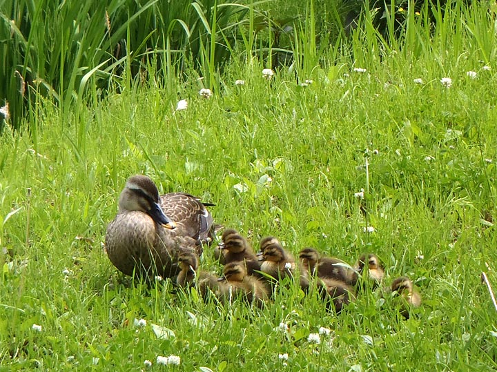カルガモ親子は菖蒲園の中にいましたが、緑に囲まれて母鳥から離れないヒナを見ると、実にほのぼのとした雰囲気がありました。