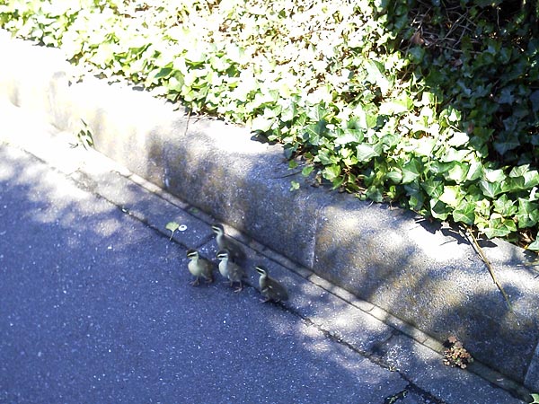 近所の歩道でカルガモのヒナ4羽を見かけた。
