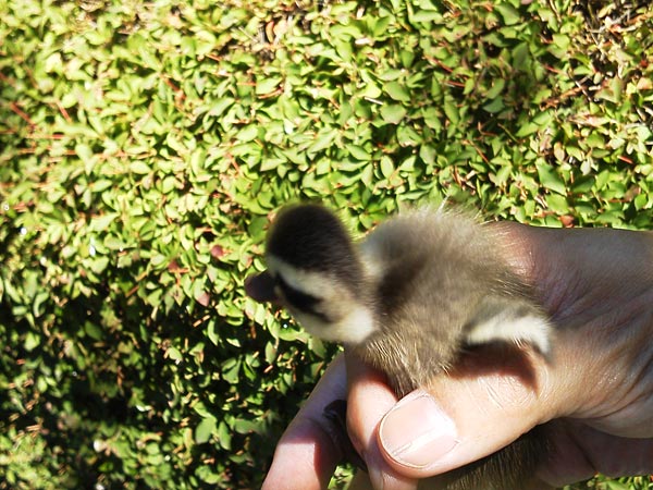 カルガモのヒナだからと簡単に掴まるだろうと思っていたら、意外に逃げ足が速い。