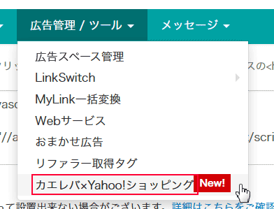 管理画面内の上部、「広告管理/ツール」メニューにカーソルをあて表示されたプルダウンから「カエレバ×Yahoo!ショッピング」をクリック。