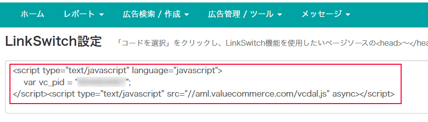 『LinkSwitch』JSタグをHTMLの<head>~</head>間に貼る