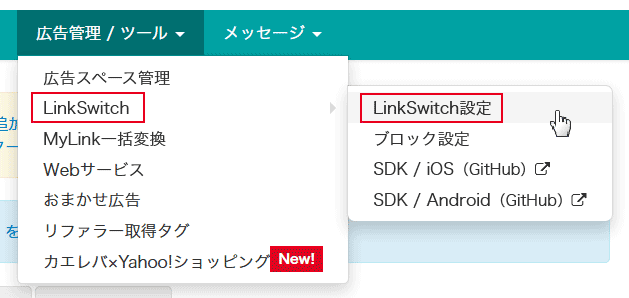 管理画面内の上部、「広告管理/ツール」メニューにカーソルをあて表示されたプルダウンから「LinkSwitch」にカーソルをあて、「LinkSwitch設定」をクリック