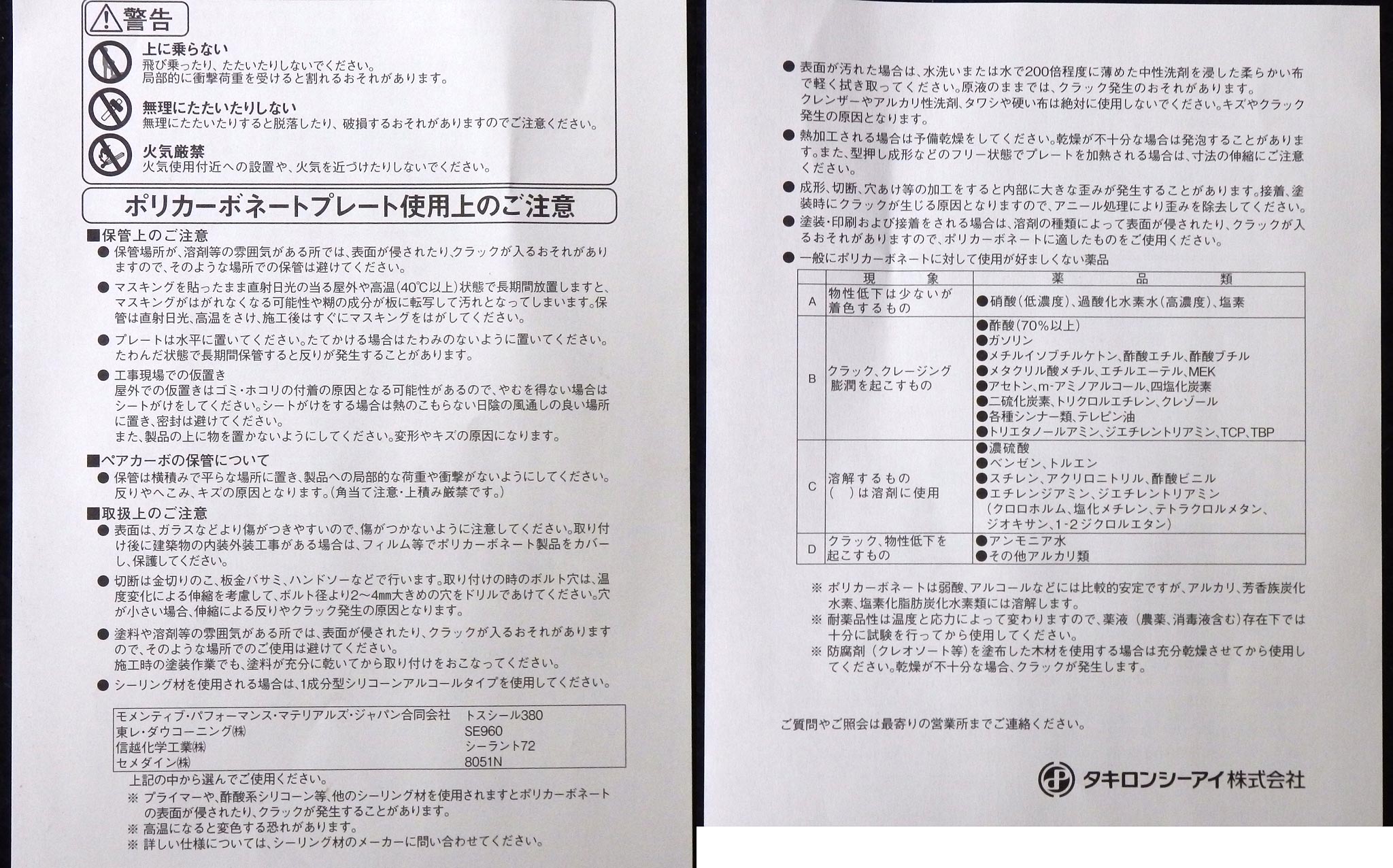 ポリカーボネートの取扱説明書。