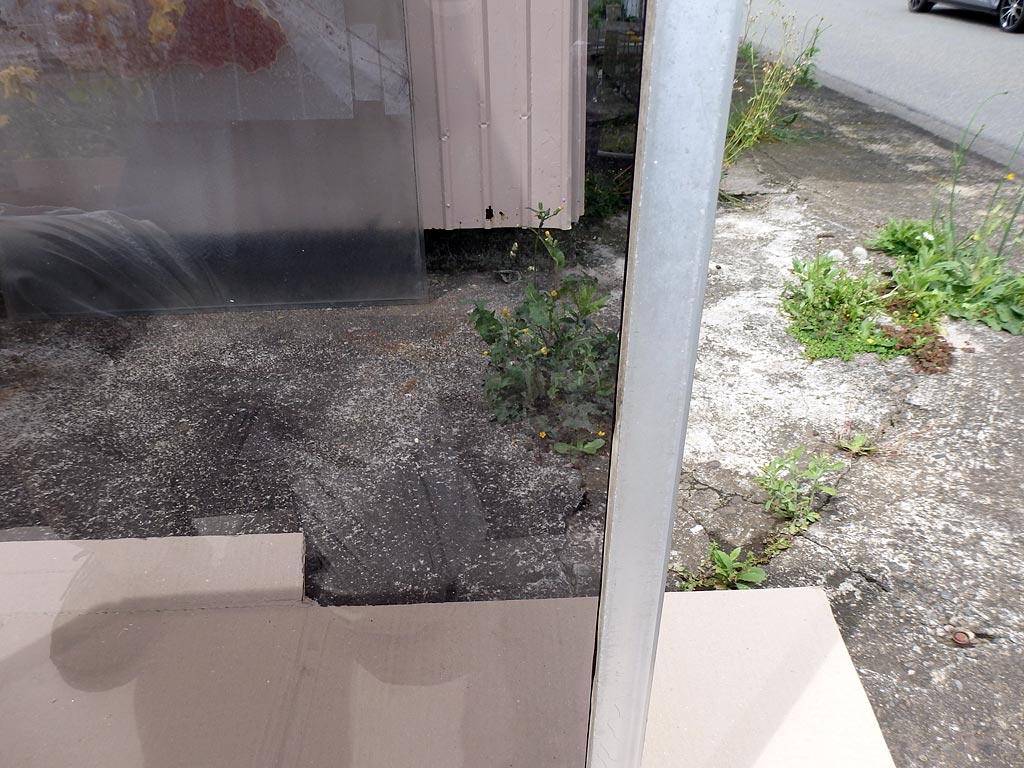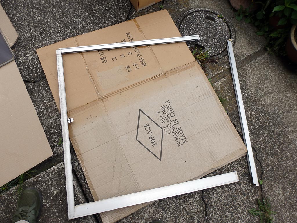 サッシのフレームの片側を外し、ガラスを抜いた後。