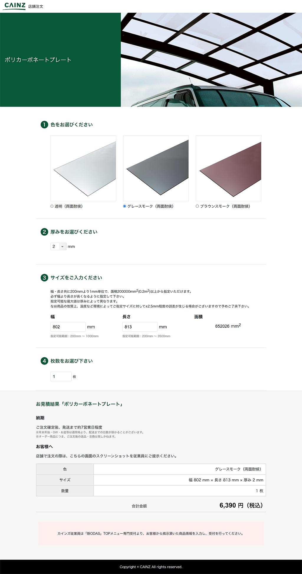カインズホームのポリカーボネートプレート見積もり結果