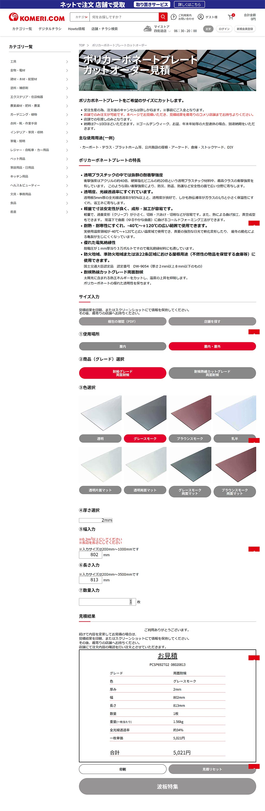 コメリのポリカーボネートプレートカットオーダー見積もり結果