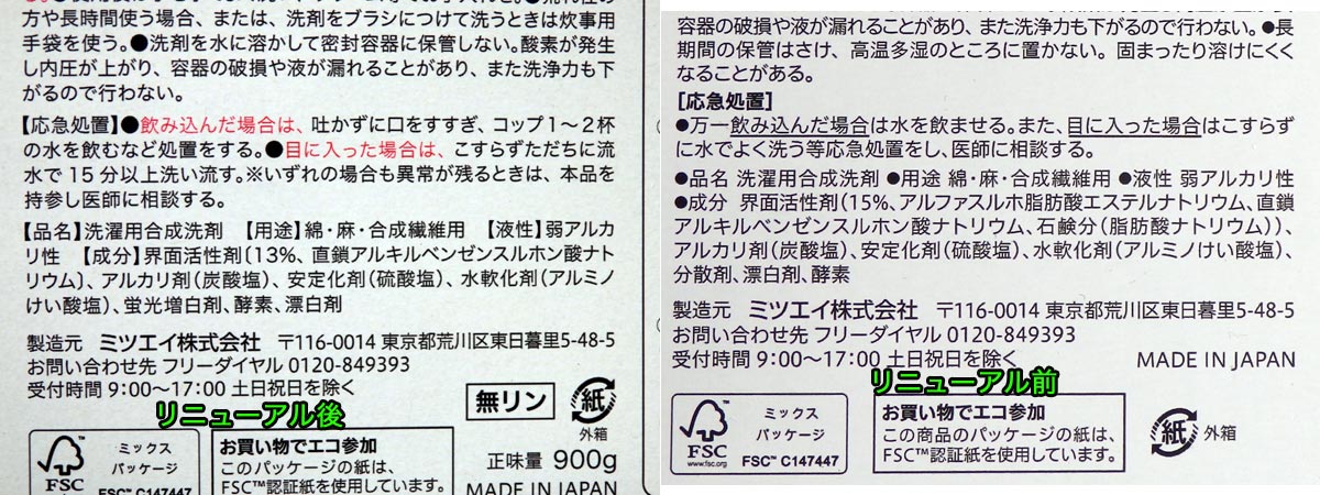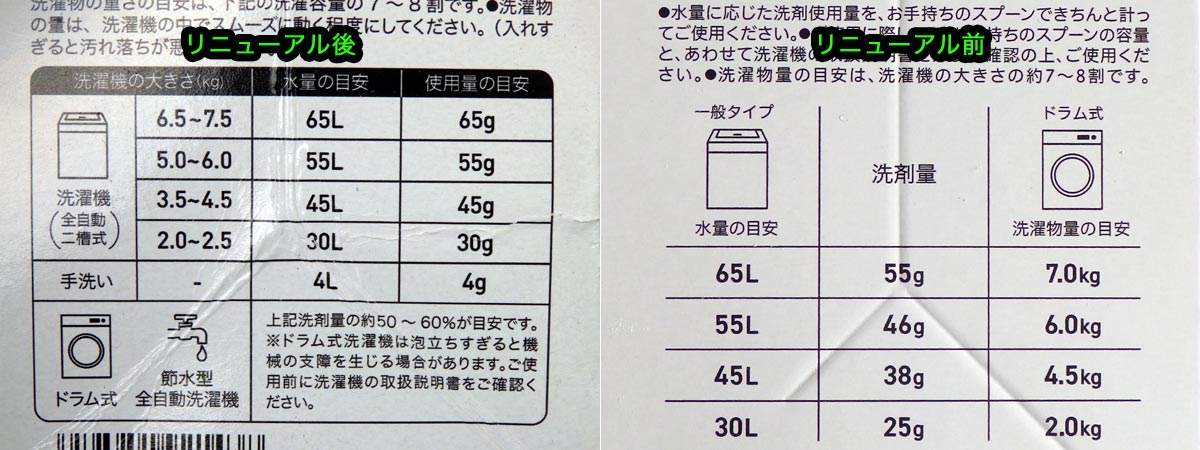 界面活性剤が15%から13%に減り、界面活性剤の種類もアルファスルホ脂肪酸エステルナトリウム、直鎖アルキルベンゼンスルホン酸ナトリウム、石鹸分(脂肪酸ナトリウム)と3種類入っていたものが、直鎖アルキルベンゼンスルホン酸ナトリウムのみになっている。