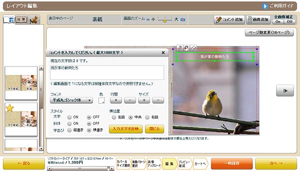 ここで写真の編集・レイアウト、文字・スタンプ入れ、背景変更を行う。
