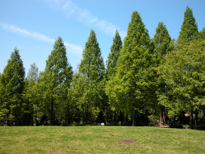 秋になると葉が赤くなり、青空とのコントラストは見事だが、新緑のメタセコイアもなかなかいい。