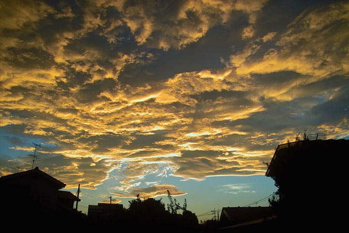 今日の夕焼けは低い雲に夕日が当たり、立体的な空が印象的だった。