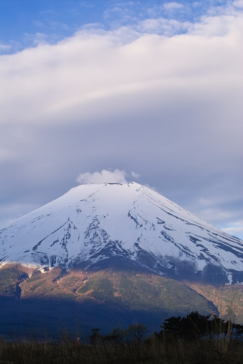 富士山の東側がぽっかり穴が開いたように雲がなく、そこから朝日が差込み、富士山に帯できたように光が当たってました。