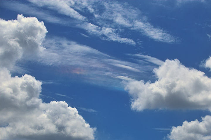 雨が降り続いた明けの今日、日差しの強い正午に彩雲が出ていたのを見つけた。