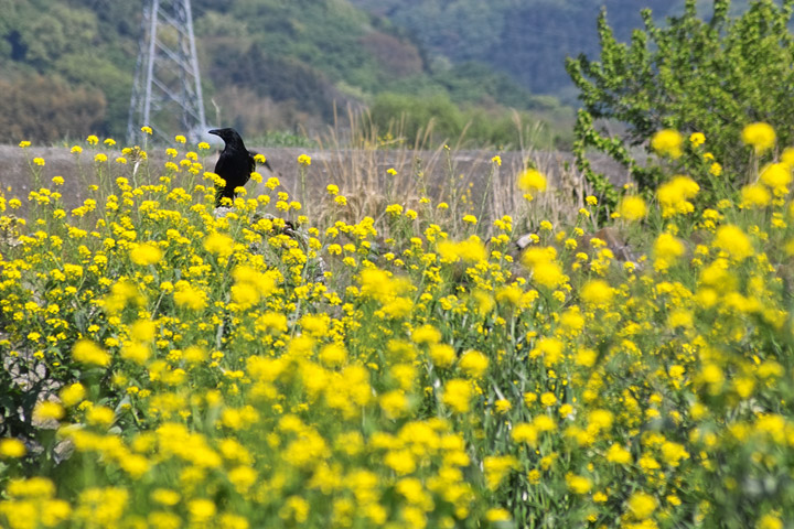 相模川の鯉のぼりを写しに行って、河川敷に菜の花が咲いているのを見つけて撮影していると、一羽のカラスが。