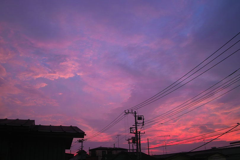 あたりが急に黄色くなった(太陽からの光を黄色のフィルタに通したかと思うくらい)後、太陽が沈んで行くにしたがって空が赤く染まって行きました。