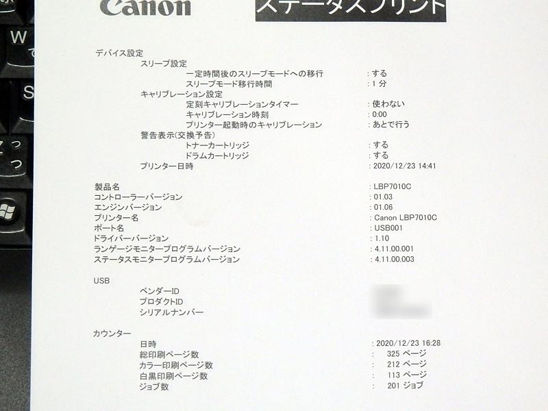 LBP7010C機種仕様|Canon Q&A検索(よくあるご質問)」には、約1,000枚印刷できると記載があるが、私のLBP7010Cは325枚でトナー切れとなった。