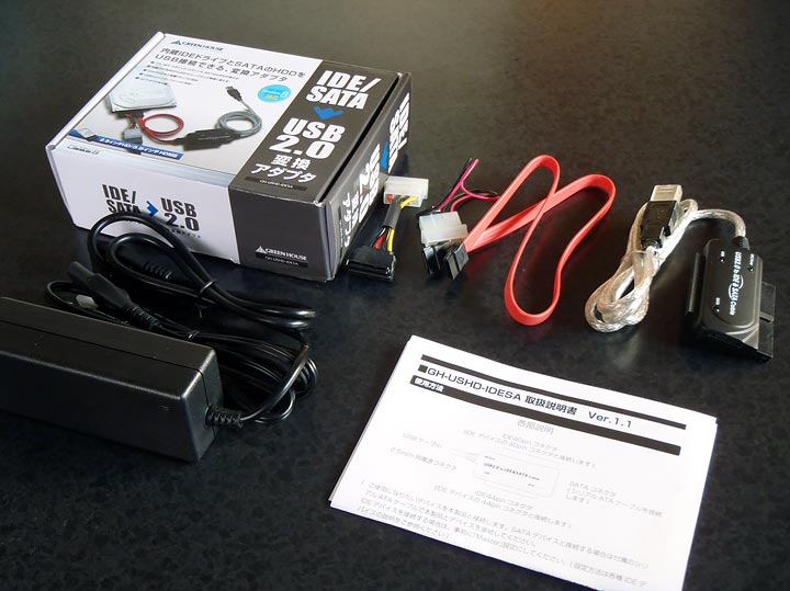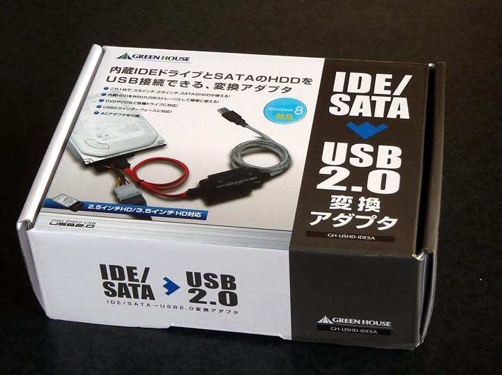 そこで、代替の外付けケースの購入を考えたが、内蔵光学ドライブ、IDEハードディスク、SATAハードディスクすべてに使えるグリーンハウスのGH-USHD-IDESAにした。