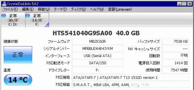 このHDDはThinkPad X60s一号機に付いていた40GBのHDD。