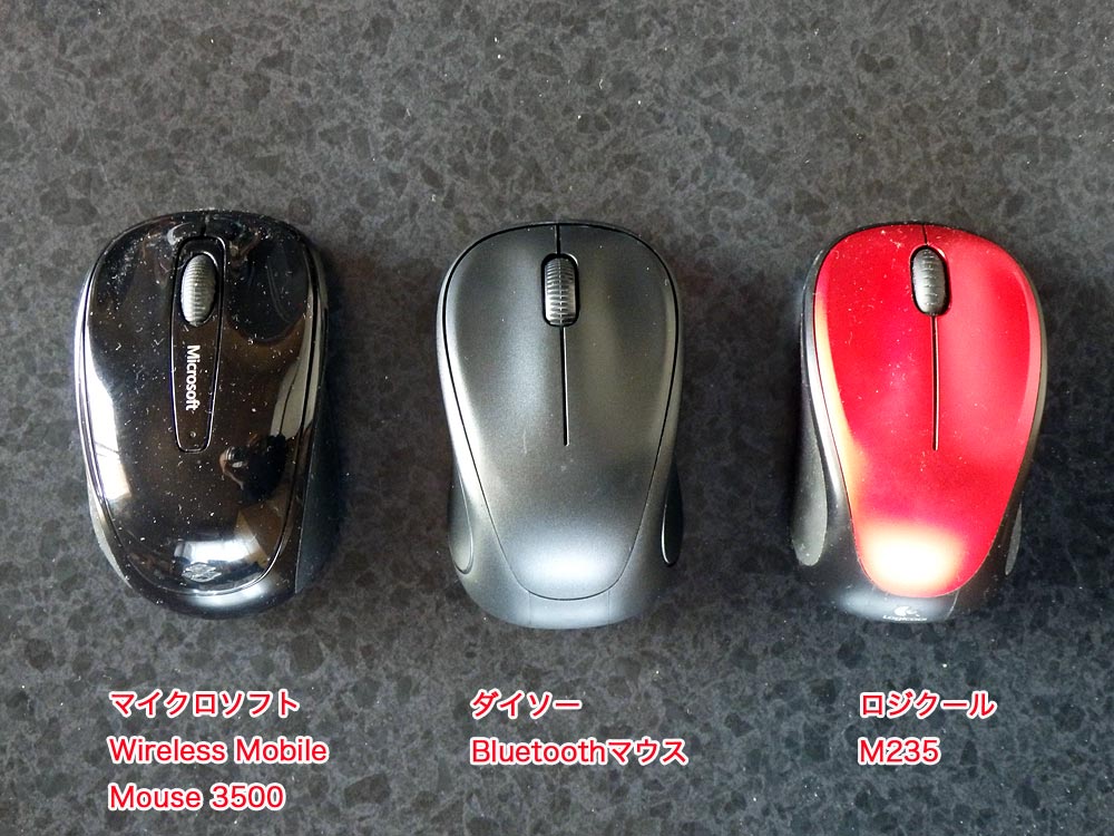 左からマイクロソフト Wireless Mobile Mouse、ダイソー Bluetooth WIRELESS MOUSE、ロジクール M235。