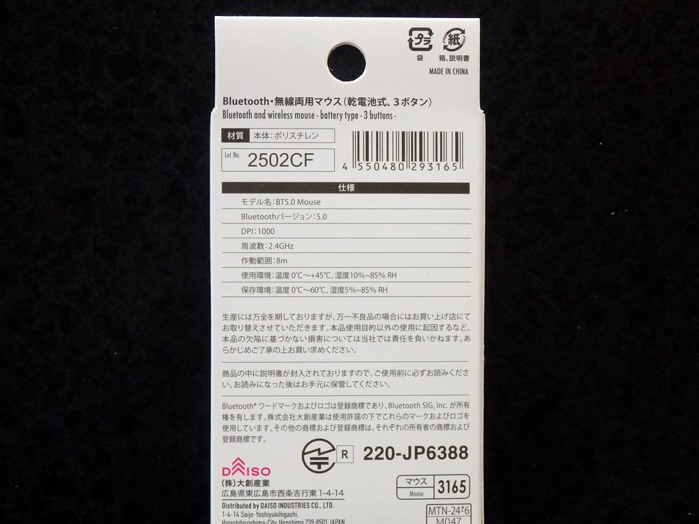 ダイソー 新モデル Bluetooth WIRELESS MOUSEの箱。
