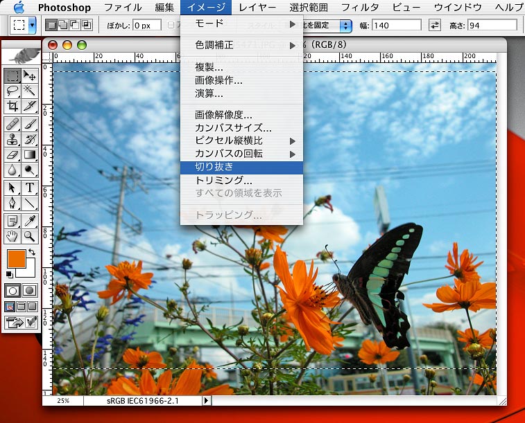 「矩形選択ツール」を選択し、縦横比を固定を選んで、幅140、高さ94を入力後、画像を選択。