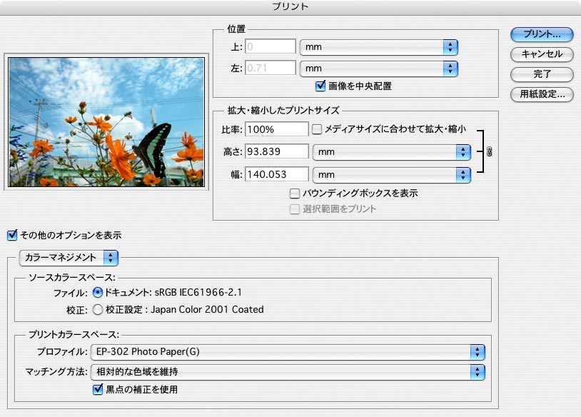これはすでにPhotoshop側で、画像のプロファイルから印刷用のプロファイルへの変換処理を設定しており、プリンタ側では色の変換処理をさせないため。