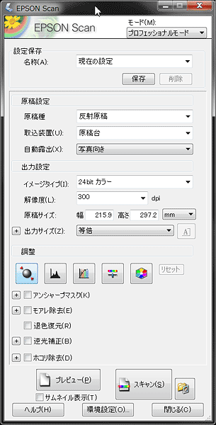 写真原稿向き、300dpi、等倍出力、調整なしでスキャン。