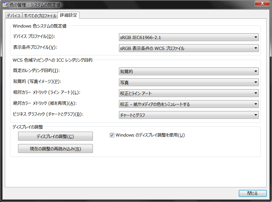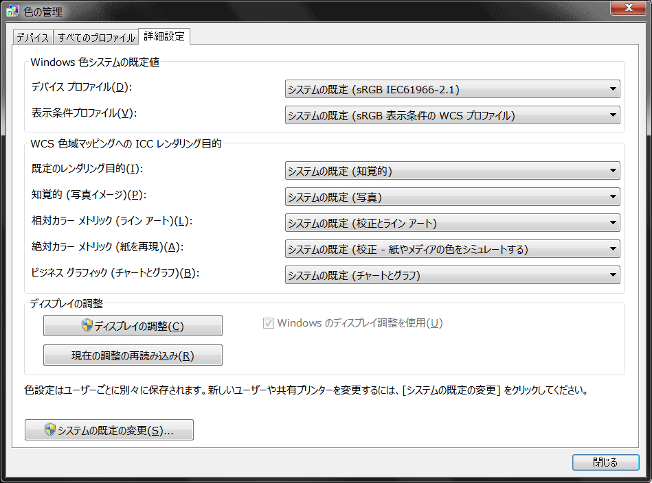 1. コントロールパネル→色の管理→「詳細設定」タブを開き、「システムの既定の変更」をクリックする。
