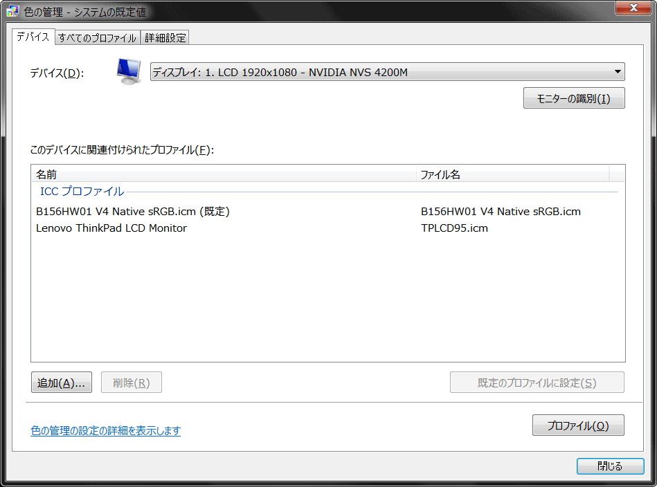 「このデバイスに関連付けられたプロファイル」内に指定したカラープロファイルが表示される。