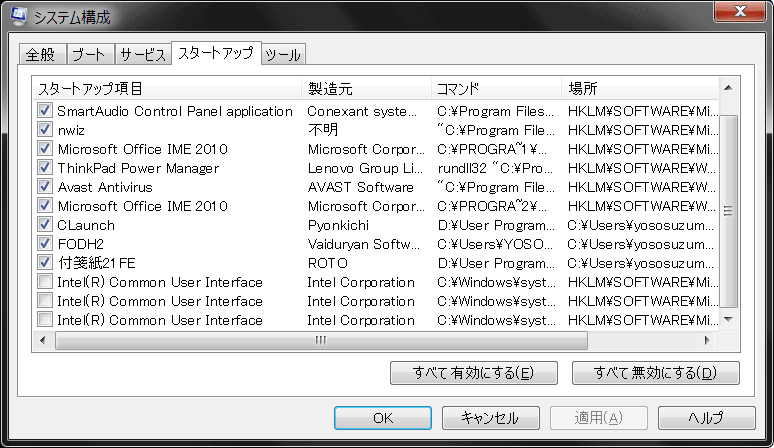 - システム構成ウィンドウが表示されるので「スタートアップ」タブを選択し、3つある「Intel(R) Common User Interface」すべてのチェックを外す。