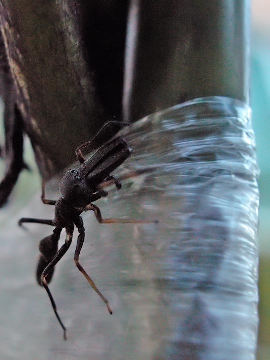 このアリグモも、他のハエトリグモと同じく、COOLPIX5000で大きく撮影しようとカメラを近づけると、ナスの茎の裏側に隠れて撮影するのが大変だった。