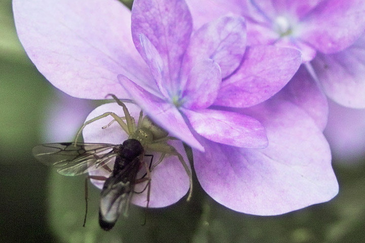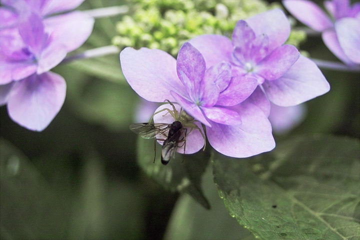 アジサイの花びらの下でアブのような昆虫を捕まえていた。