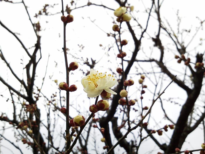 先週の土曜日(2013/1/26)に相模原北公園に行ったときには、梅の花は咲く様子は見えなかったのに(相模原北公園花便り2013年1月26日)、一週間経った今日(2/2)行ってみると、二本の梅の木に、花が数輪咲いていた。