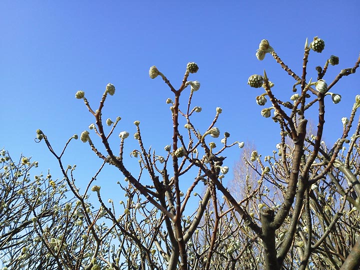 ちょっと場所を変えて、水が流れるバラ園の花壇へ行くと、ミツマタが蕾を抱えている。