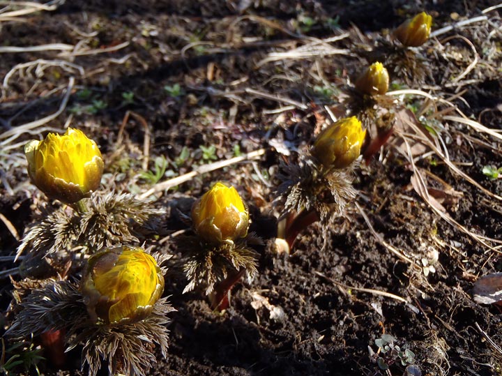 福寿草は、日が当たると花は開き、日が陰ると閉じるそうで、写真を撮影したときは、まだ日が弱かったのかな。