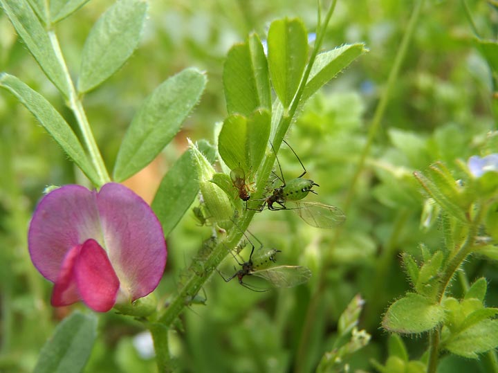 カラスノエンドウの周りには、オオイヌノフグリなども咲いているのですが、なぜかカラスノエンドウだけにアブラムシがついていました。