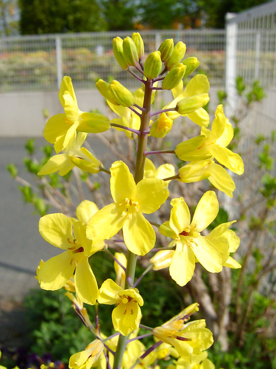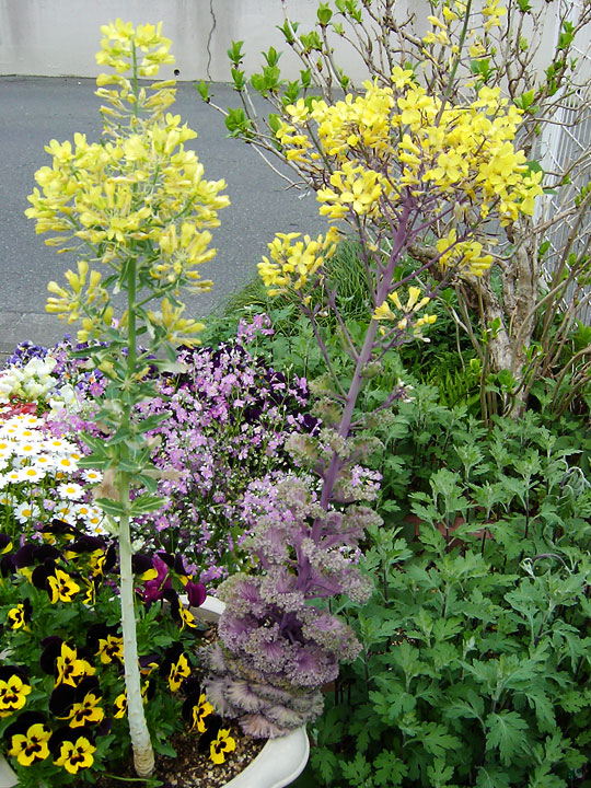 一方は葉牡丹独特の葉が散り、長い茎の咲きに花が咲いている。