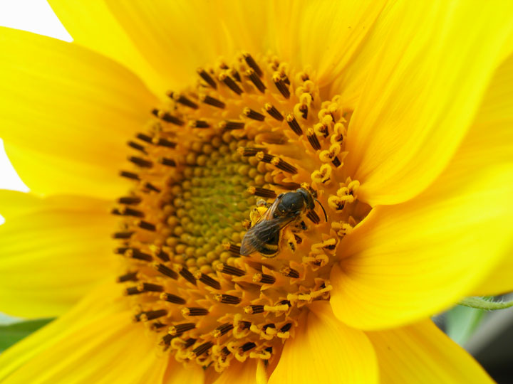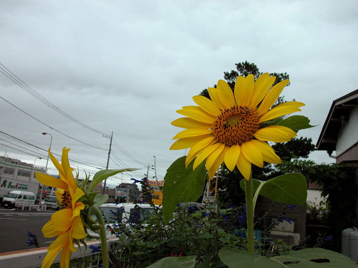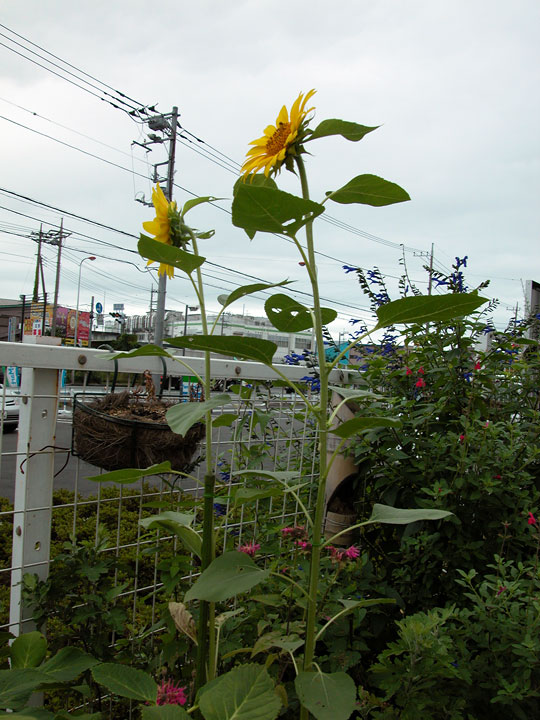以前、シジュウカラ用に置いていたヒマワリの種が芽を出していたが、とうとう花を咲かせた。