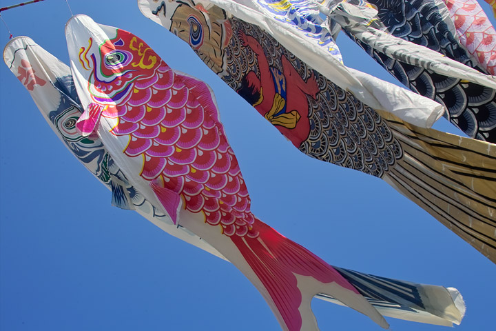 初日に混まないようにと朝9時前に行ってみると、風が凪いで鯉のぼりは泳いでいなかった。