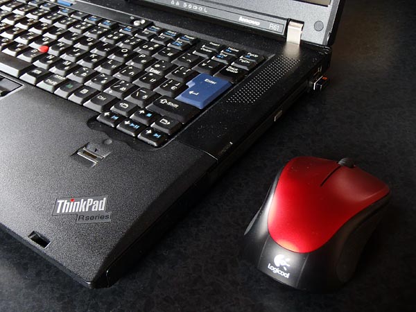 - ThinkPadのUSB端子は左1、右2。有線マウスだとケーブルが邪魔になるので無線マウスにする。