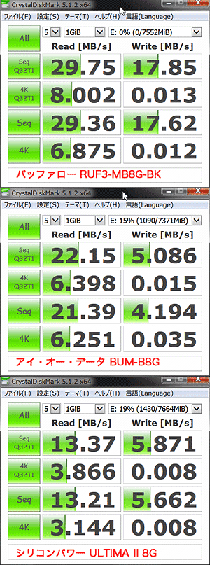 バッファロー RUF3-MB8G-BK、アイ・オー・データ BUM-B8G、シリコンパワー Ultima-II I-Series 8GのCrystalDiskMark速度比較。
