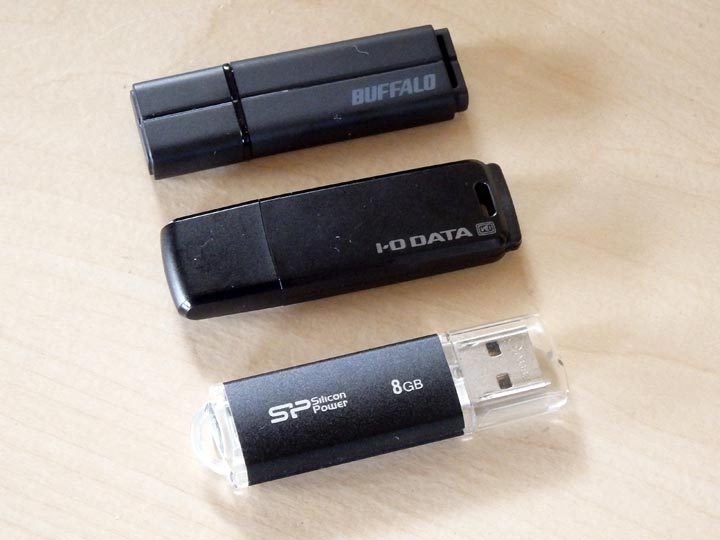 バッファロー RUF3-MB8G-BKと持っている8GBのUSBメモリ アイ・オー・データ BUM-B8G、シリコンパワー Ultima-II I-Series 8G本体の比較。