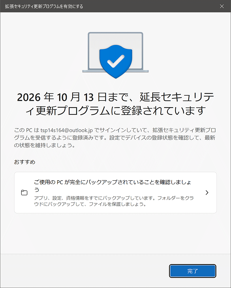 ネットではWindowsバックアップやoneDrive有効が必要という情報があるが、今回ESU適応したかぎり必要なかった。